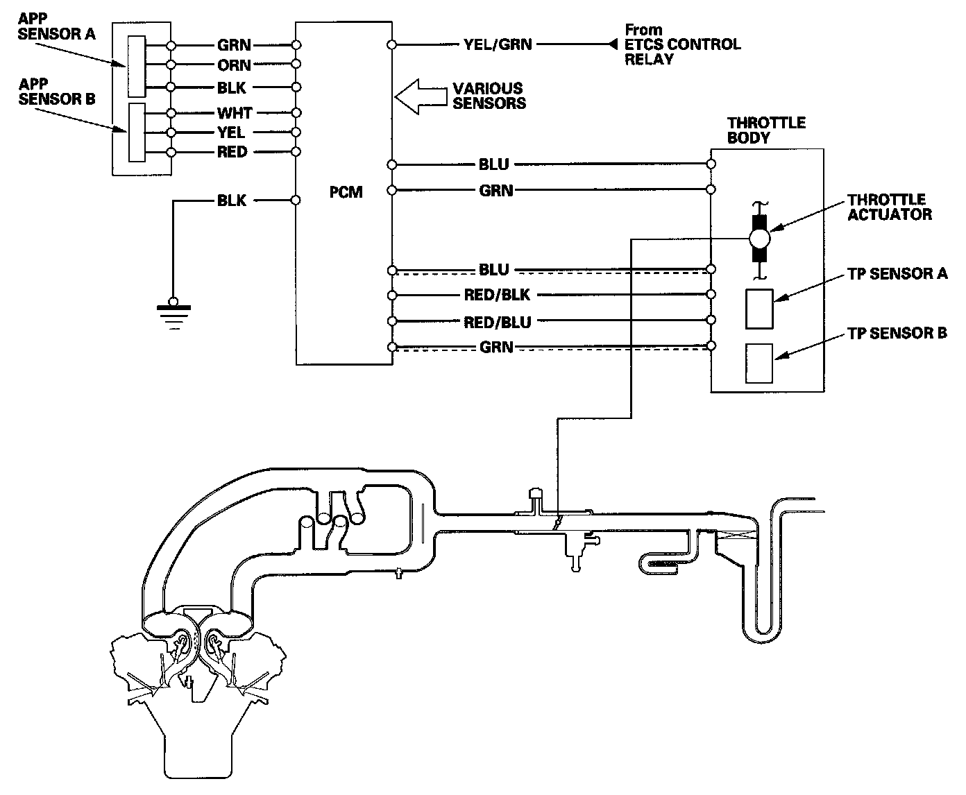 Electronic Throttle Control System DiagramThe electronic throttle control system consists of the throttle actuator, throttle position (TP) sensor A/B, accelerator pedal position (APP) sensor A/B, the electronic throttle control system (ETCS) control relay, and the PCM.