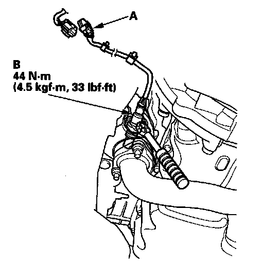 1. Disconnect the rear secondary HO2S 4P connector (A), then remove the rear secondary HO2S (B).