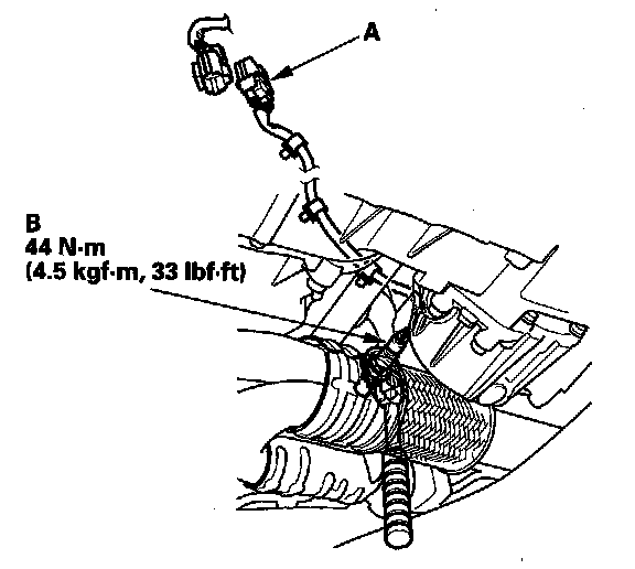 1. Disconnect the front secondary HO2S 4P connector (A), then remove the front secondary HO2S (B).