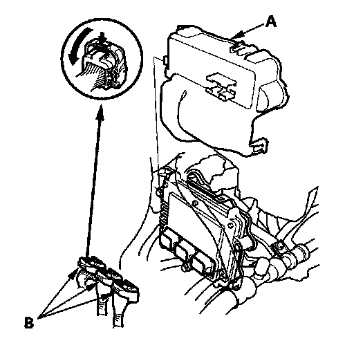 2. Remove the cover (A). Disconnect the PCM connectors (B), and probe the terminals from the terminal side of the connectors.