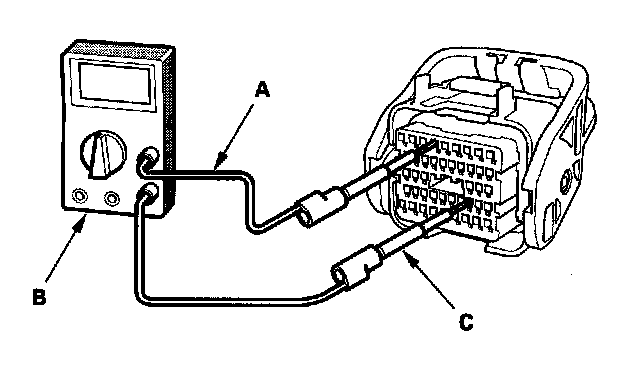 4. Connect one side of the patch cord (A) terminals to a commercially available digital multimeter (B), and connect the other side of the patch cord terminals to a commercially available banana jack (Pomona Electronics Tool No. 3563 or equivalent) (C).