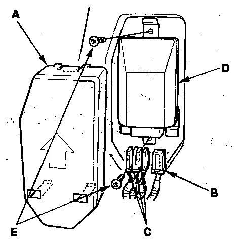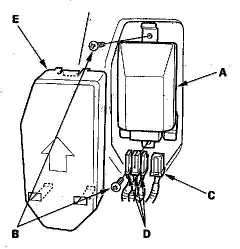 1. Place the new OPDS/ODS unit (A) on the seat-back frame. Tighten the two screws (B), and connect the OPDS unit 8P/ODS unit 18P connector (C) and sensor connectors (D) to the OPDS/ODS unit. Reinstall the cover (E).