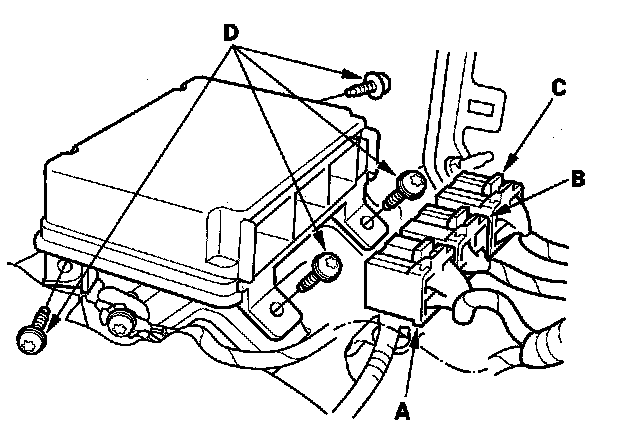 4. Disconnect SRS unit connector A (28P), SRS unit connector B (28P), SRS unit connector C (28P), and remove the TORX bolts (D), then pull out the SRS unit.