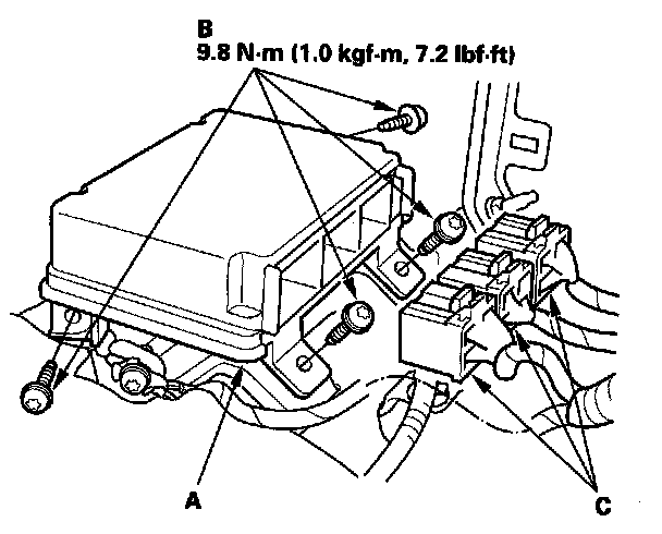 1. Install the new SRS unit (A) with TORX bolts (B), then connect the connectors (C) to the SRS unit; push them into position until they click.