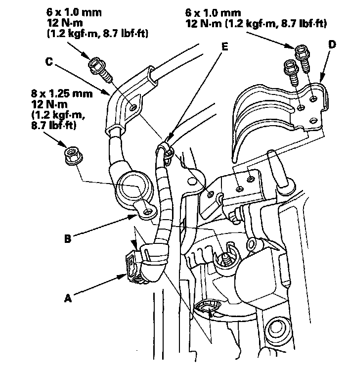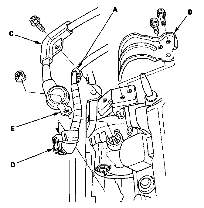 3. Install the harness holder (C), then install the harness clamp bracket (D) and harness clamp (E).
