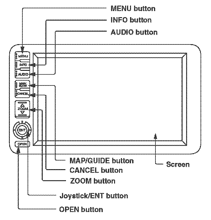 Screen - All selections and instructions are displayed on the screen. This is a touch-screen display; you can enter information into the system by touching the images or icons with your finger. For example, you can enter a street name on the displayed keyboard by touching the individual letters.