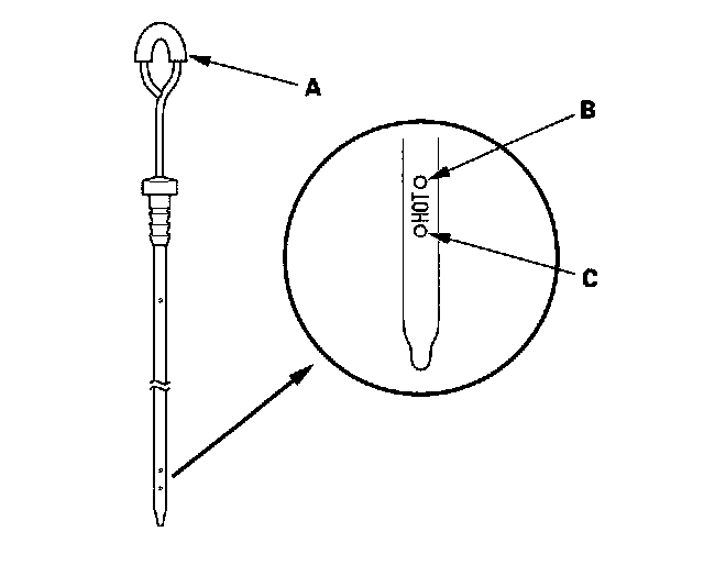 5. Remove the dipstick (A) and check the fluid level. It should be between the upper mark (B) and the lower mark (C).