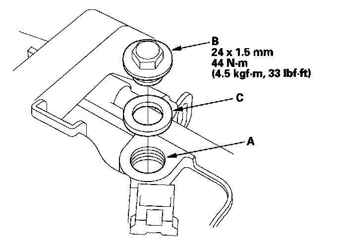 8. Install the ATF filler bolt (B) and a new sealing washer (C).