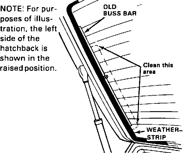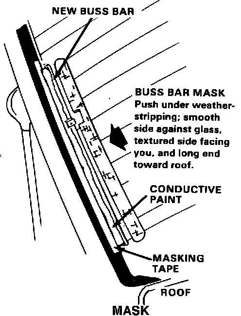 Install a new buss bar on each side of the rear window glass. If the window has been replaced, inspect the buss bars to make sure the window is the updated type: When viewed from the outside, the buss bars of the old style window are covered by the window weatherstripping; on the updated window, the buss bars are inboard of the weatherstripping and are completely visible.
