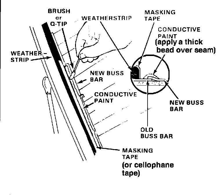 5. Put masking tape (or cellophane tape) along the edge of the weatherstrip, then apply a thick bead of conductive paint along the outboard edge of the new buss bar (where it overlaps the old buss bar).