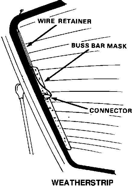 11. Remove the masking tape from the weatherstrip, reconnect the defogger wire, then reinstall the plastic wire retainer under the weatherstrip, next to the end of the buss bar mask.