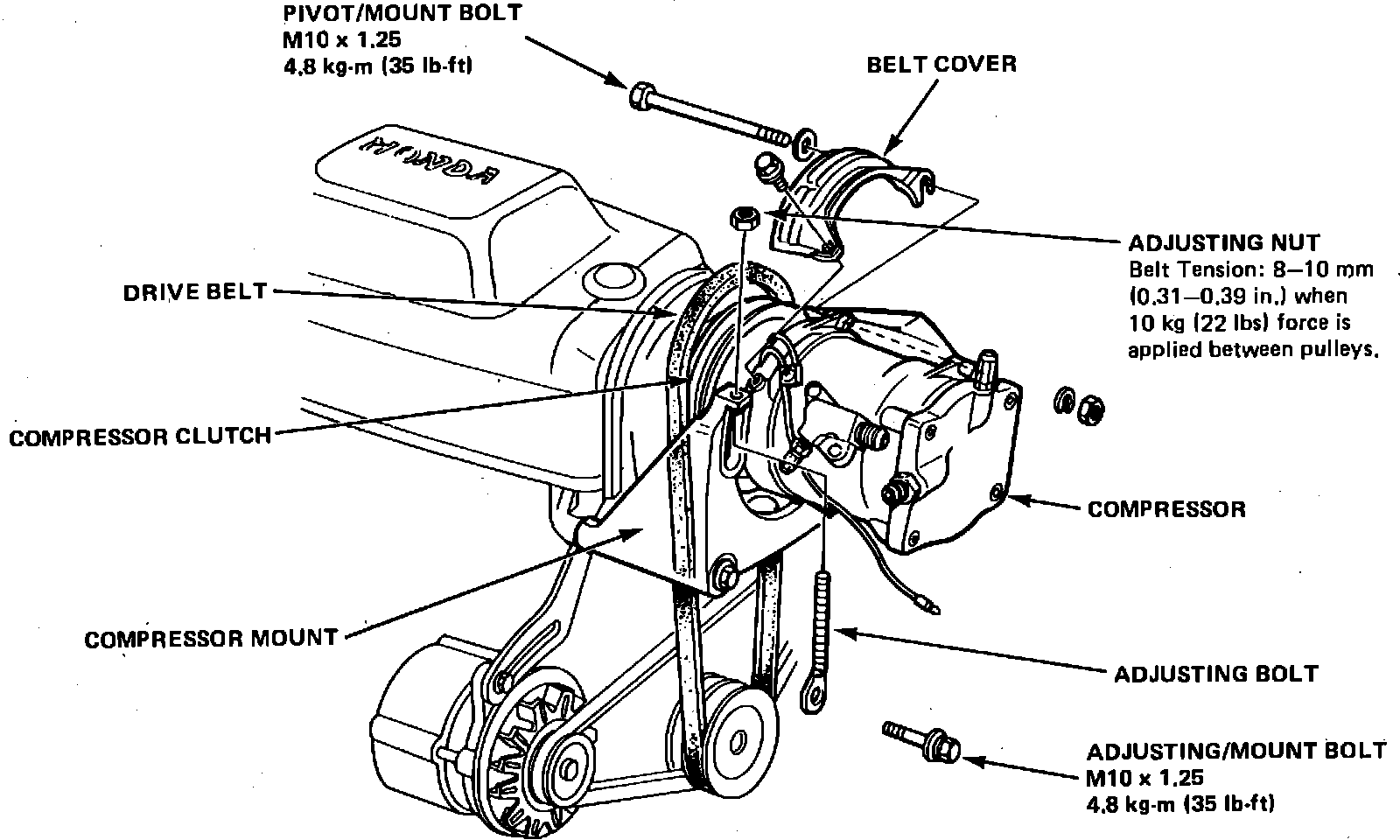 7. Remove compressor adjusting and mount bolt, then loosen the pivot and mount bolt, Fig. 4.