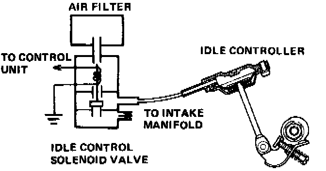 The idle controller keeps the idle speed from dropping when the compressor is running. An idle controller operated by the manifold vacuum is attached to the throttle linkage. Vacuum is controlled by an idle control solenoid valve that is energized when the A/C switch is on and compressor clutch is energized.