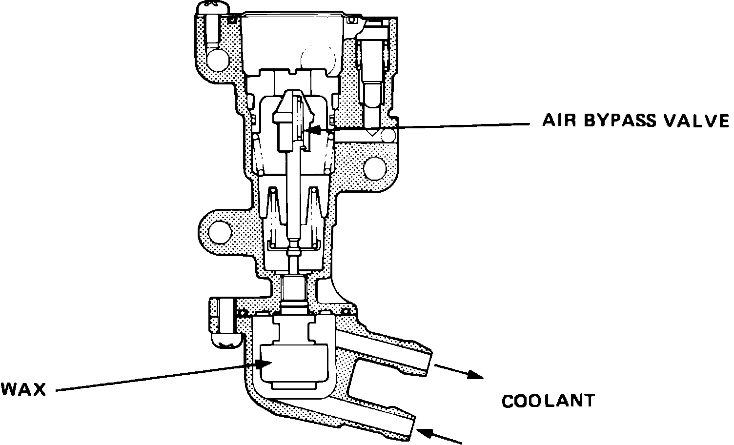 The air bypass valve is controlled by a thermowax plunger, Fig. 9. When the thermowax is cold, the valve is open. When the thermowax is heated, the valve is closed. When the engine is cold the valve allows additional air to bypass into the intake manifold so that engine idles faster than normal. When engine reaches normal operating temperature, the valve begins to close, reducing amount of air bypassing into the intake manifold.
