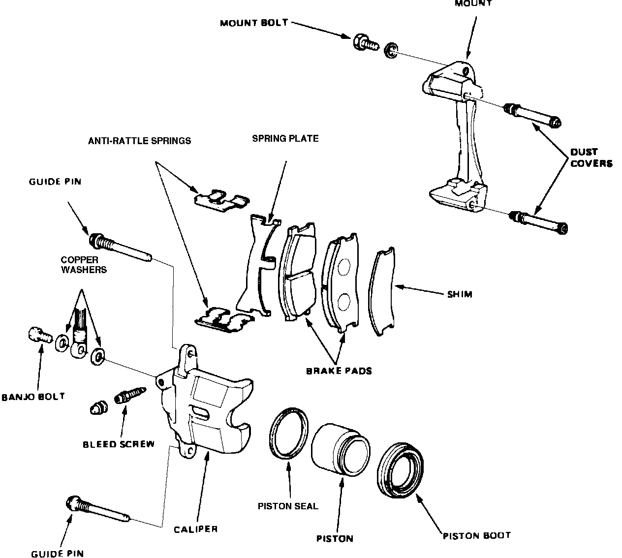 Fig. 12 Front disc brake caliper exploded view. 1986-88 Accord & 1984-87 Prelude w/fuel injected engine: