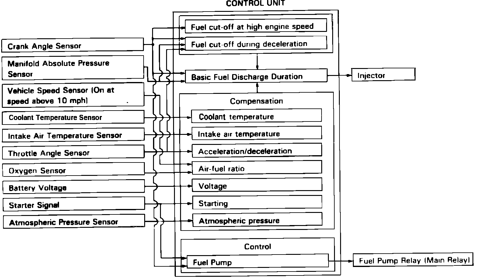 When the ignition switch is turned to the run position, the ECU supplies a ground to the main relay. This causes the fuel pump to run for two seconds, thus pressurizing the fuel system.