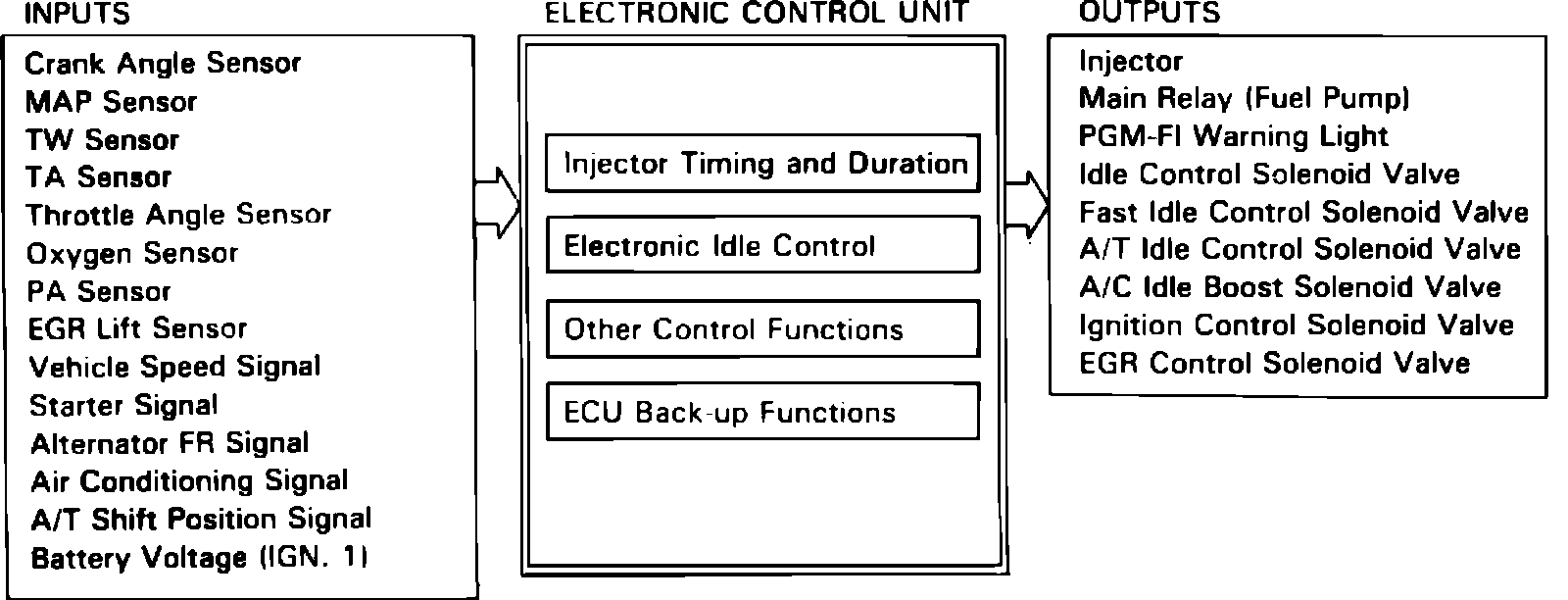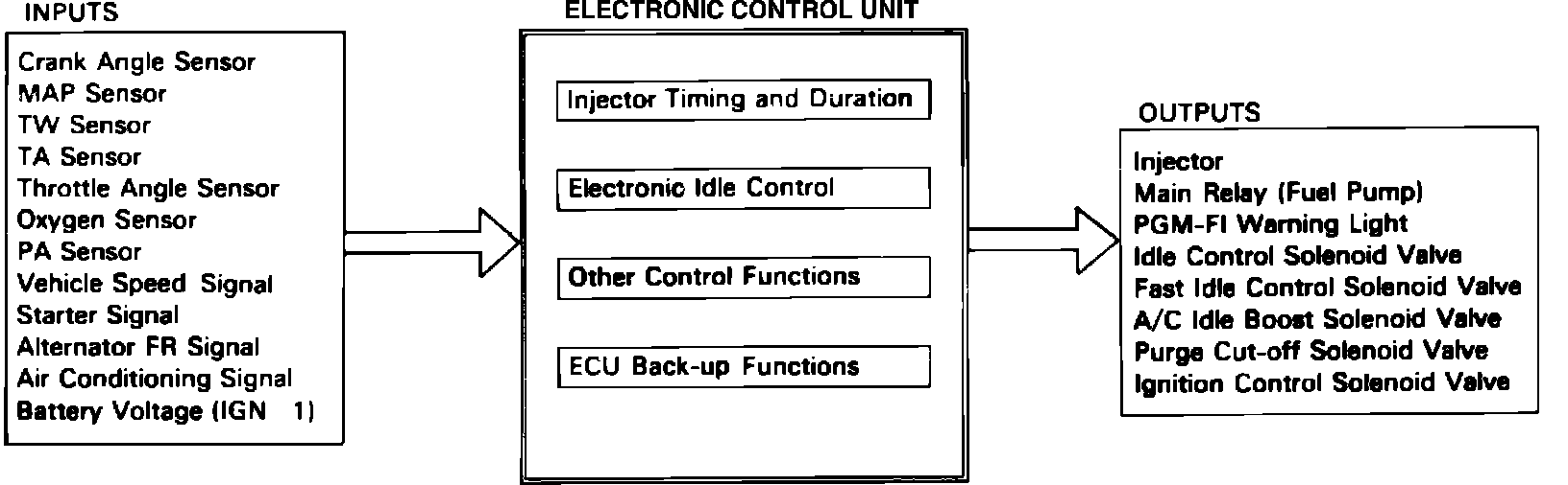 The Programmed Fuel Injection (PGM-FI) System is an electronically controlled multi-point fuel injection system that consists of three major sub-systems: Air Intake and Idle Control System, Electronic Control System and Fuel System. The electronic control system provides centralized microprocessor control over the fuel and air intake systems, and provides a self-diagnostic function to aid in diagnosing system malfunctions.