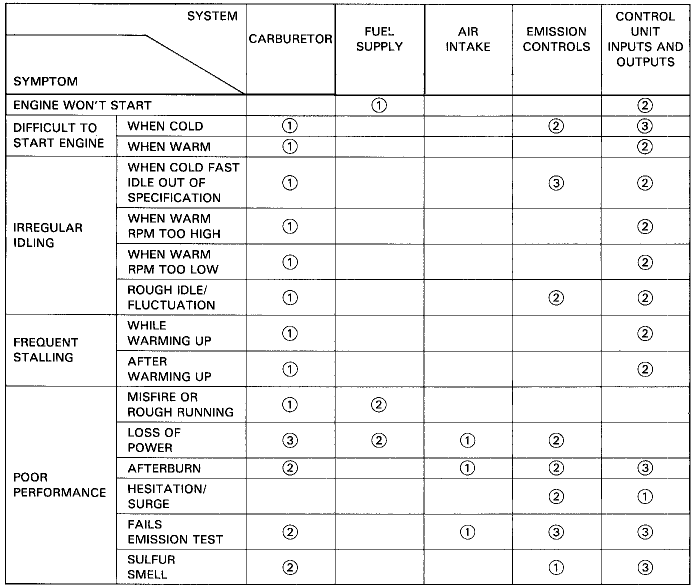 NOTE: Across each row in the chart, the systems that could be sources of a symptom are ranked in the order they should be inspected, starting with (1). Find the symptom in the left column, read across to the most likely source, then refer to the system listed at the top of that column. If inspection shows the system is OK, try the next system (2), etc.
