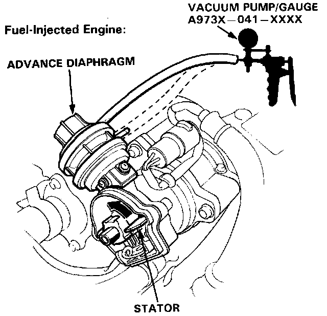 1. Remove the distributor cap and vacuum hoses (# 12, # 15 for Fuel-Injected Engine or # 2, # 25 for Carbureted Engine) from the advance diaphragm.