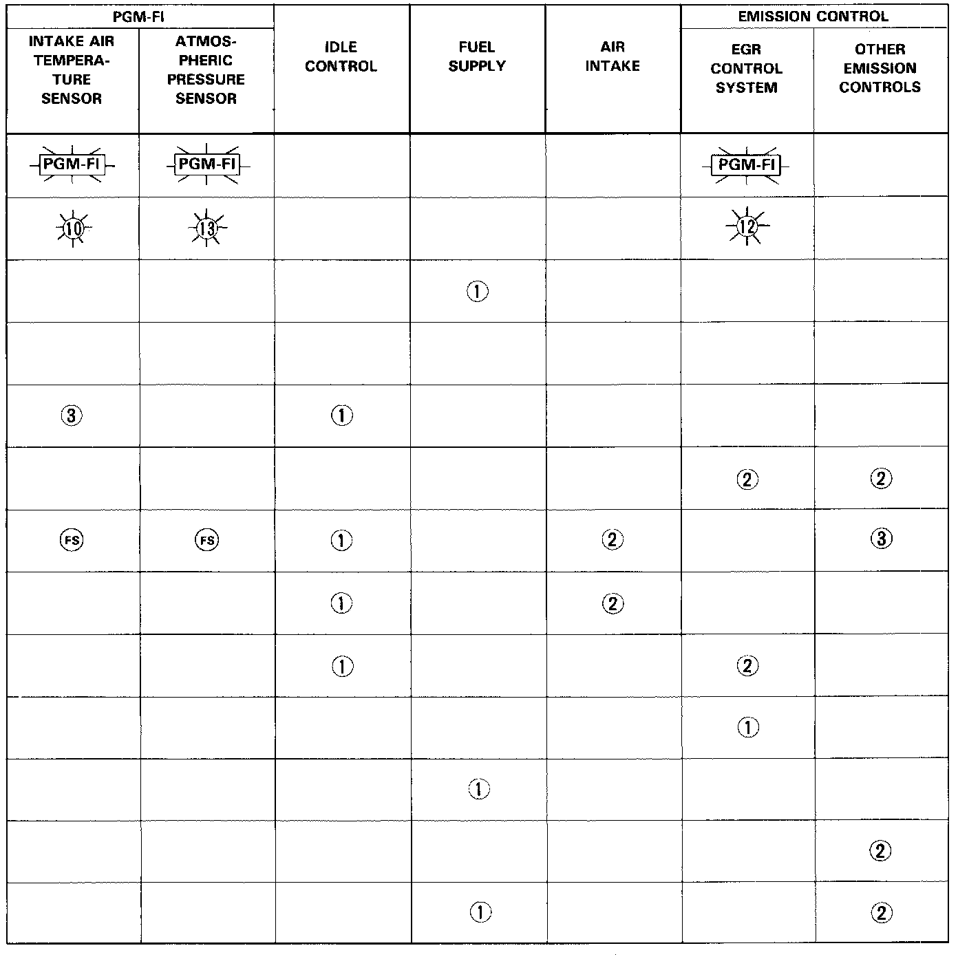NOTE: Across each row in the chart, the systems that could be sources of a symptom are ranked in the order they should be inspected starting with (1). Find the symptom in the left column, read across to the most likely source, then refer to the system or component listed at the top of that column. If inspection shows the system is OK, try the next most likely system (2) etc.