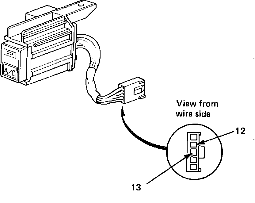 NOTE: The A/C switch contains an LED circuit and cannot be tested with ordinary circuit testers. If there is any abnormality in LED, refer to "COMPRESSOR CLUTCH ISN'T ENGAGED, WHEN A/C SWITCH IS TURNED ON". Fig. 35c.