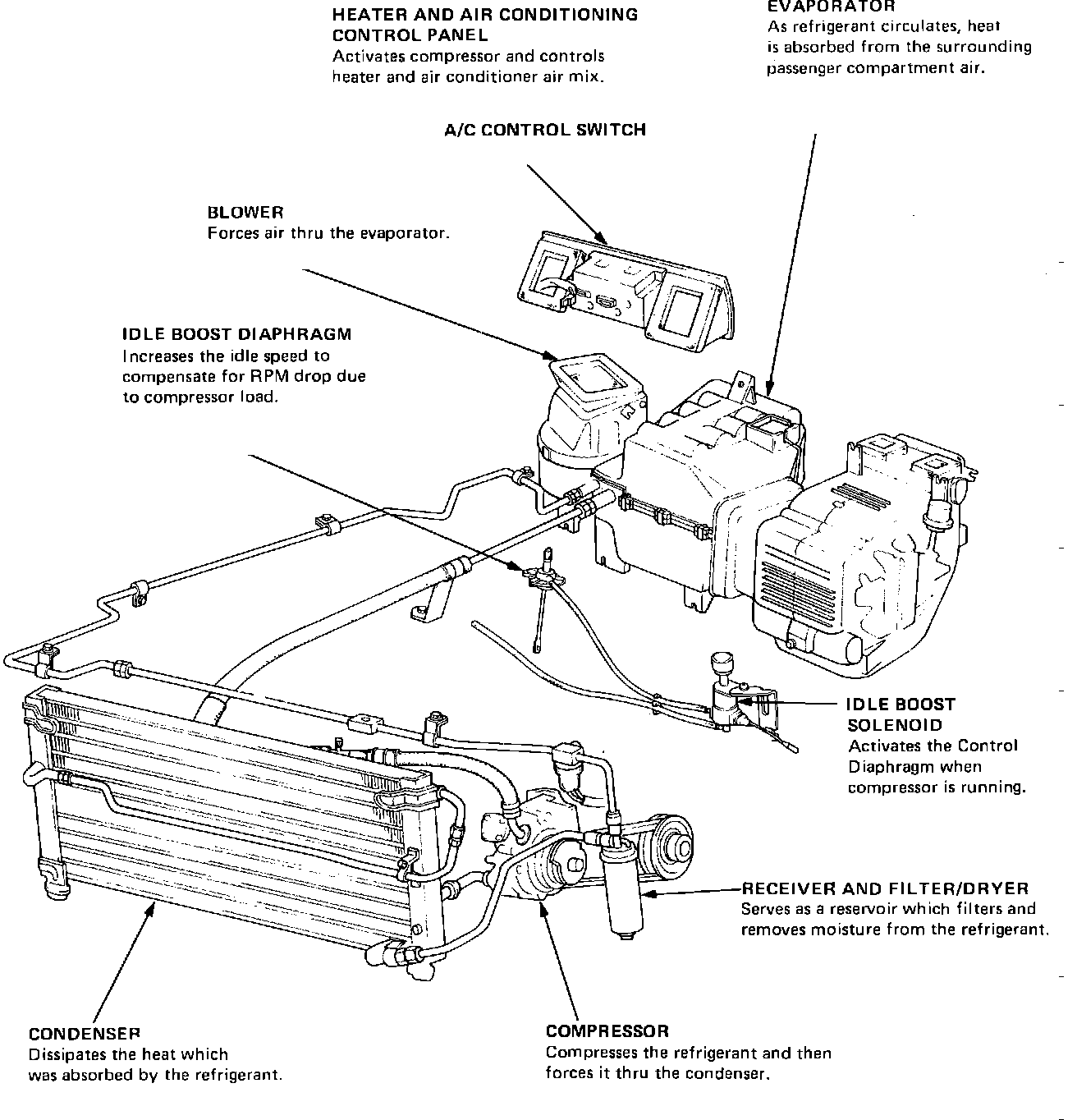 The emission control unit activates the idle boost solenoid. The idle boost solenoid increases the engine idle speed with the A/C compressor clutch engaged, to compensate for the extra load of the compressor.