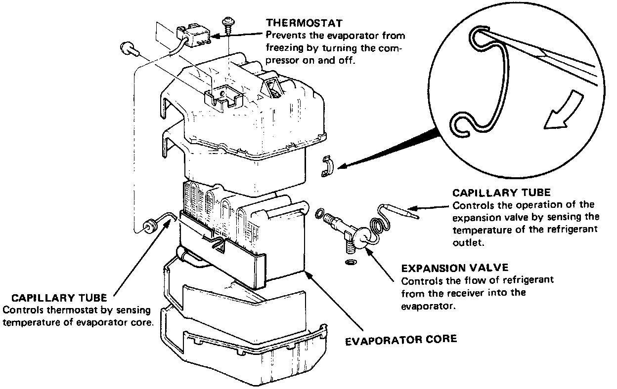 The A/C thermostat senses evaporator temperature. With the evaporator temperature above 41 degrees F (5 degrees C), the switch closes to activate the A/C compressor clutch. With the evaporator temperature below 33 degrees F (less than 1 degree C), the A/C thermostat opens. In this way, the evaporator temperature stays above 32 degrees F (0 degrees C) and moisture on the evaporator tins will not freeze and block air flow.