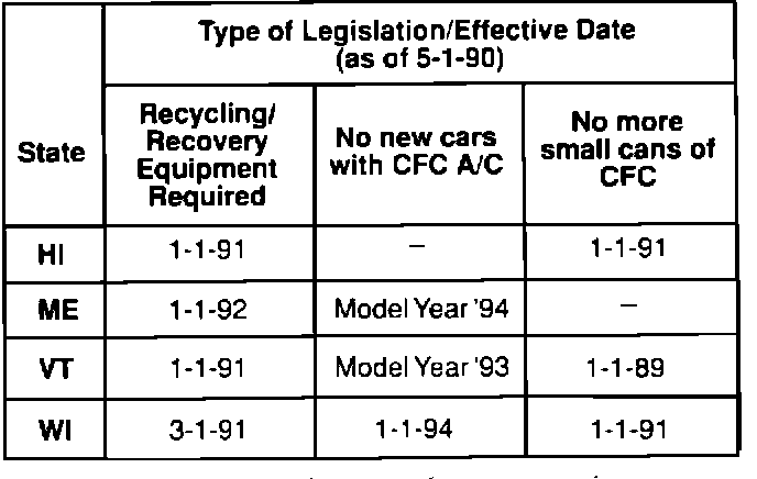 The table (compiled by the Automobile Importers of America, Inc.) shows the CFC legislation that has already been enacted by those states. There are also 14 other states that have proposed similar legislation. The federal government has not committed to any specific regulations, although they'll probably require the use of UL-listed recovery/recycling equipment only. The EPA is also talking of requiring technicians to be recertified as proficient with the new A/C equipment.