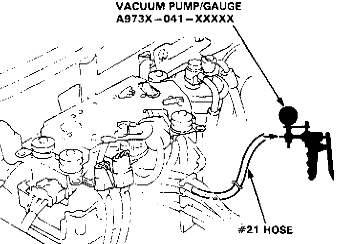 5. Stop the engine. Reconnect the # 16 vacuum hose, then disconnect the # 21 vacuum hose from the throttle body. Plug the vacuum tap at the throttle body. connect a vacuum pump to the # 21 vacuum hose, and apply a vacuum of 300 mmHg (12 in.Hg).