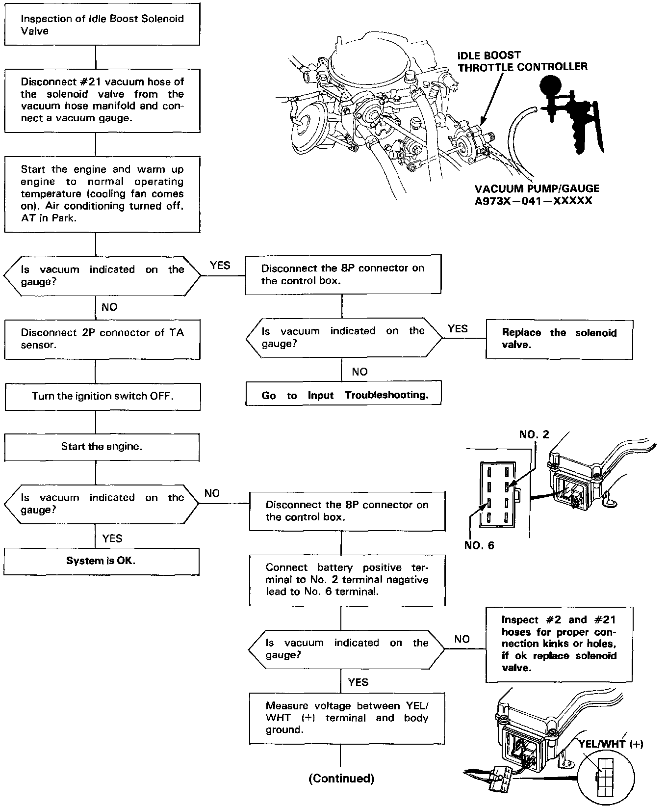 The idle boost solenoid valve is energized when the transmission is in gear or the engine air temperature is cold applying vacuum to the inner diaphragm of the idle boost throttle controller to increase rpm when there is load on the engine.