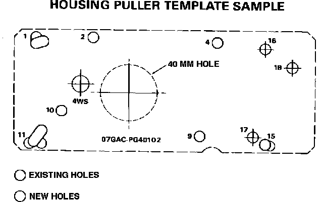 3. Cut out the template along the dotted line and place it onto the housing puller. Align the four holes punched out in step 2. Attach the template to the housing puller using four 8 x 12 mm bolts and nuts.