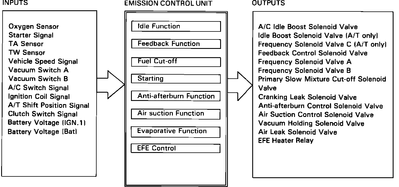 The Emission Control Unit contains logic circuits that sense the inputs and apply outputs as required to control emissions and effect smooth engine performance.