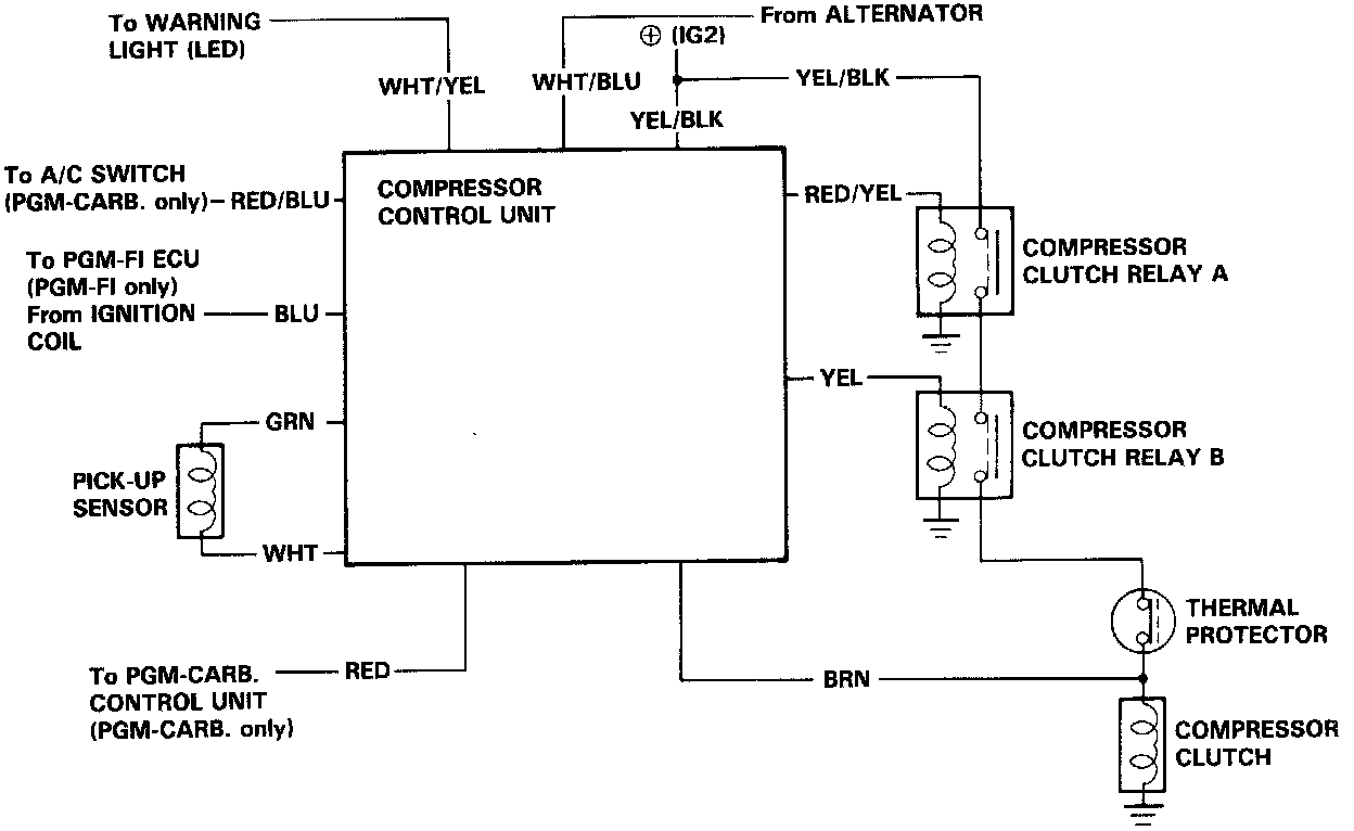 This is done by comparing the engine rpm and the compressor pulley rpm. When there is a difference in rpm that continues for more than 3 seconds, the compressor relays are turned off and the warning light comes on.