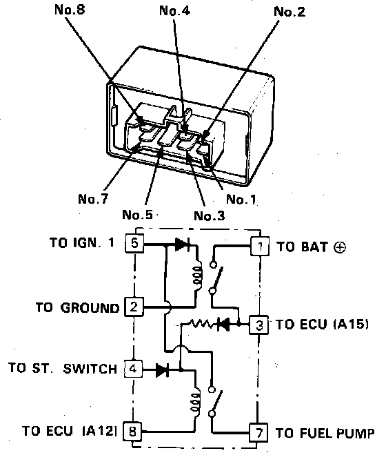 2. Attach the positive battery terminal to the #4 terminal, and the negative battery terminal to the #8 terminal of the main relay. Then check for continuity between the #5 and #7 terminals of the main relay.