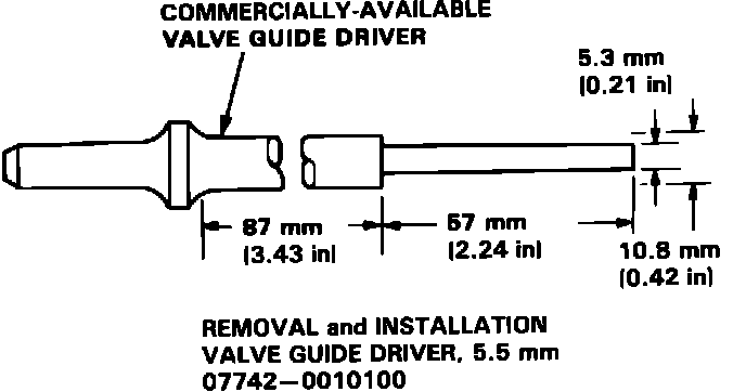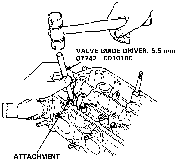 1. As illustrated, in the removal steps of this procedure use a commercially-available air-impact driver attachment modified to fit the diameter of the valve guides. In most cases, the same procedure can be done using valve guide drivers and a conventional hammer.