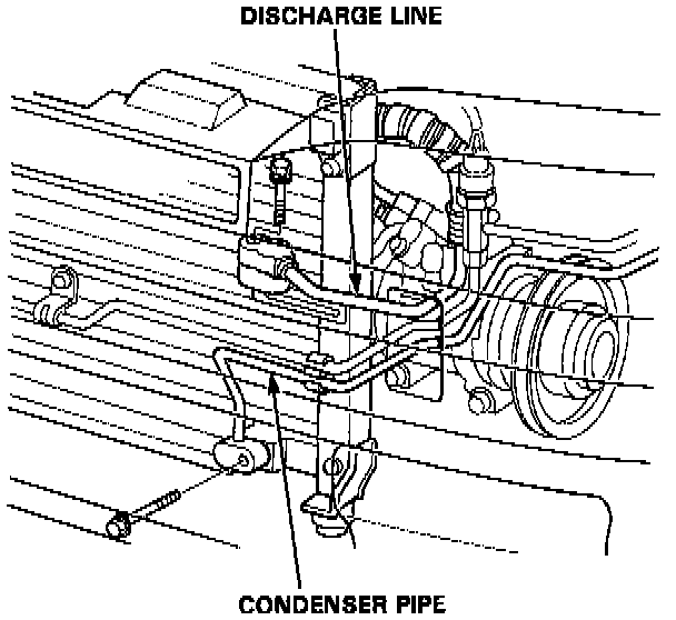 1. Use a Refrigerant Recovery/Recycling System to recover the refrigerant from the system.2. Temporarily remove the radiator reservoir tank and intake tube, then remove the suction pipe bracket.