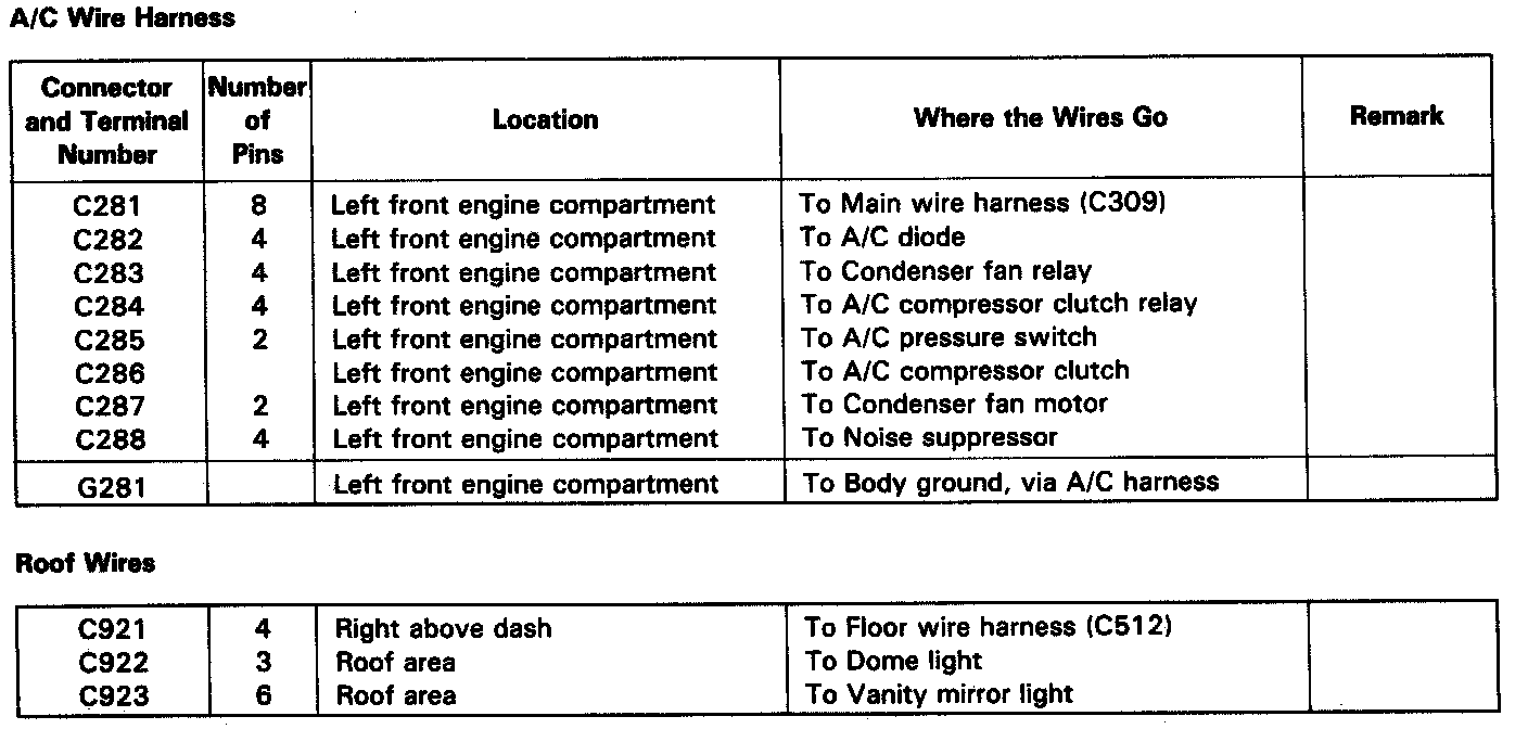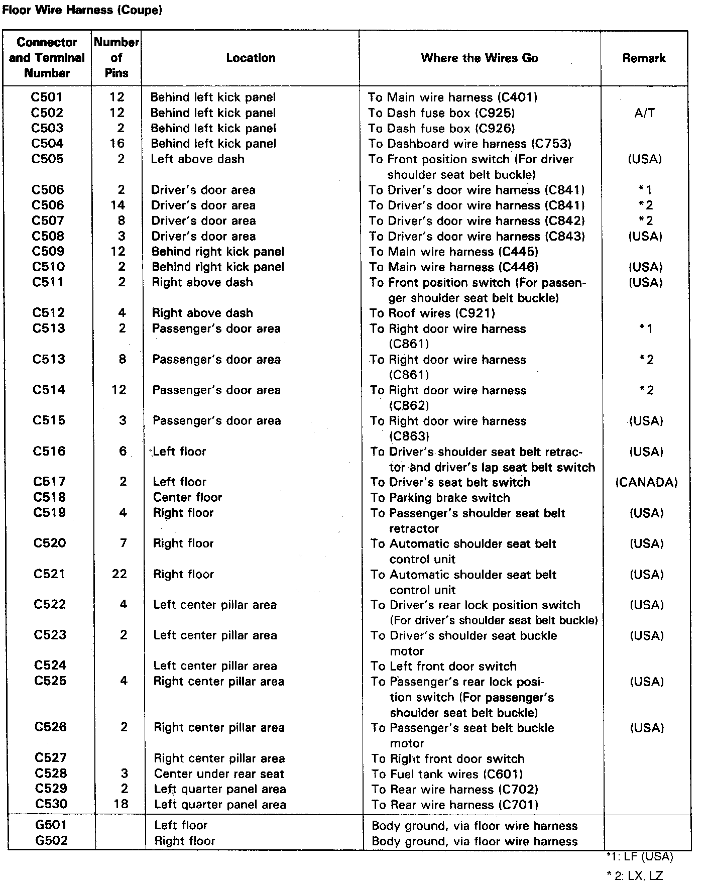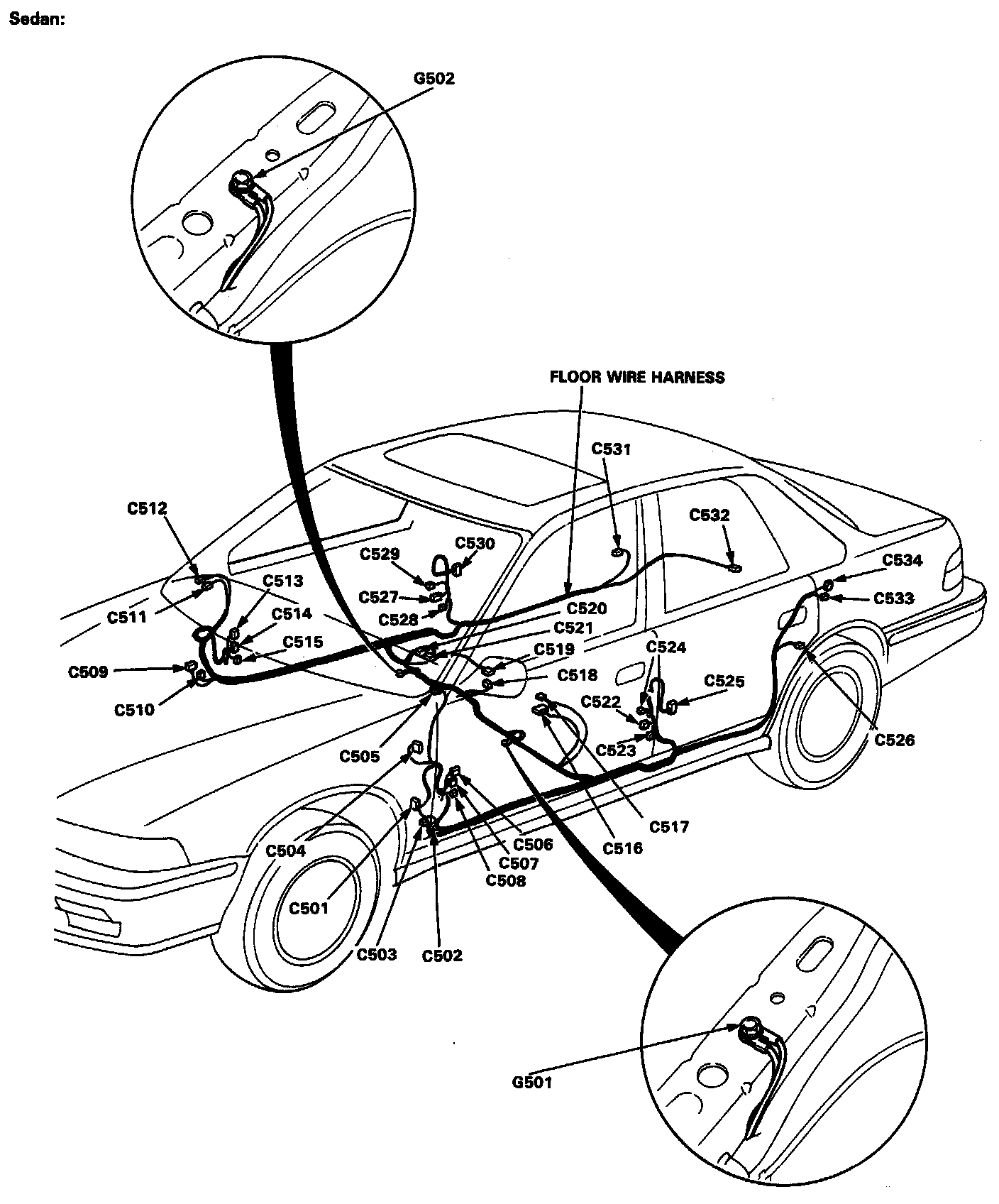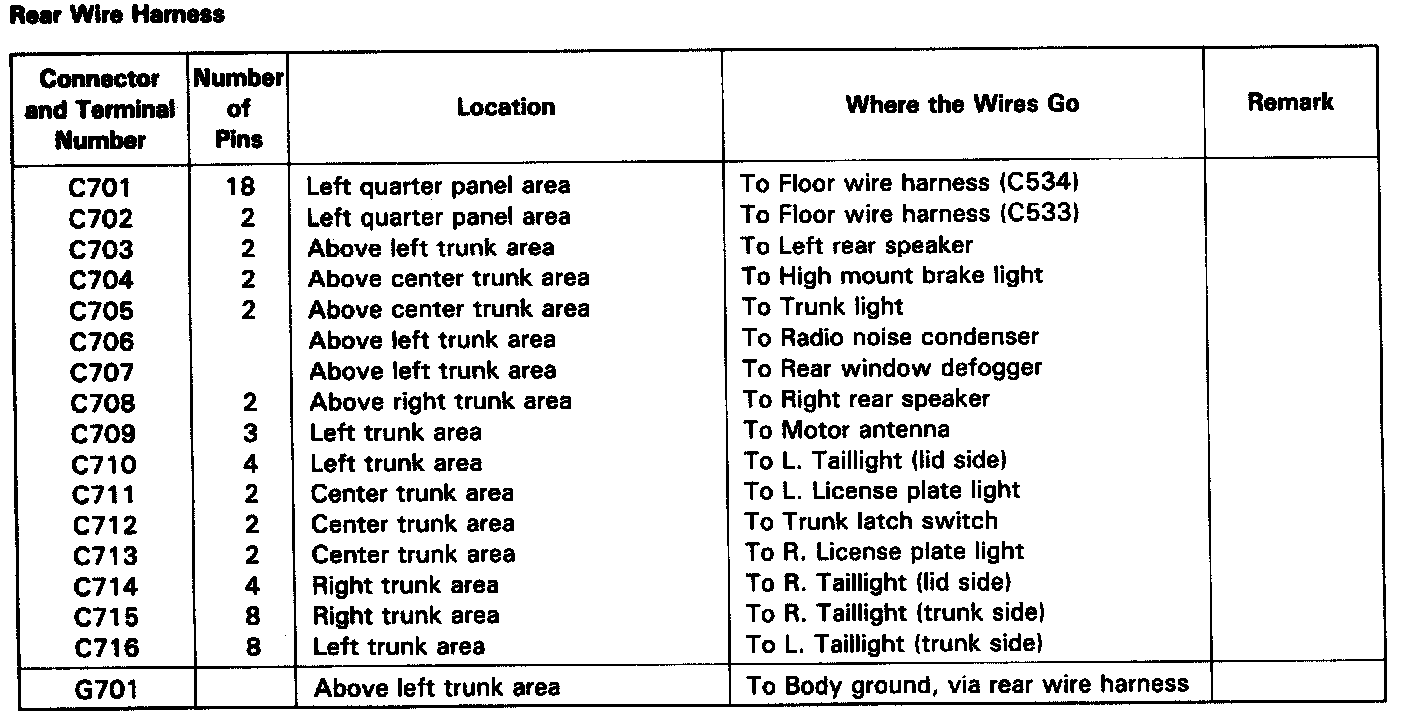 Identifying numbers have been assigned to all connectors. The number is preceded by the letter "C" for connectors, "G" for ground terminals or "T" for non ground terminals.