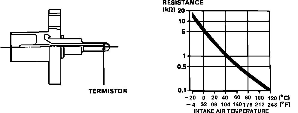The Air Intake Temperature (TA) Sensor, located on the air cleaner housing, is a temperature sensitive resistor (thermistor). The resistance of the thermistor decreases as the intake air temperature increases. This signal is used by the ECU to determine the intake air density (oxygen content), and is used in the fuel mixture calculations.