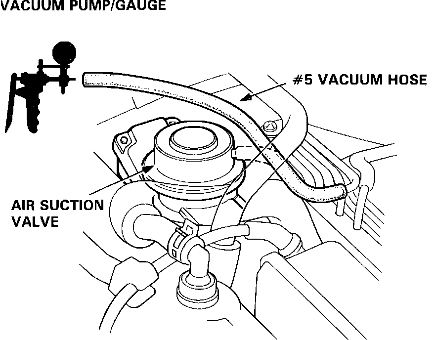 4. If a "bubbling" noise is heard, disconnect the #5 vacuum hose from the air suction valve and connect it to a vacuum gauge. No vacuum should be available.