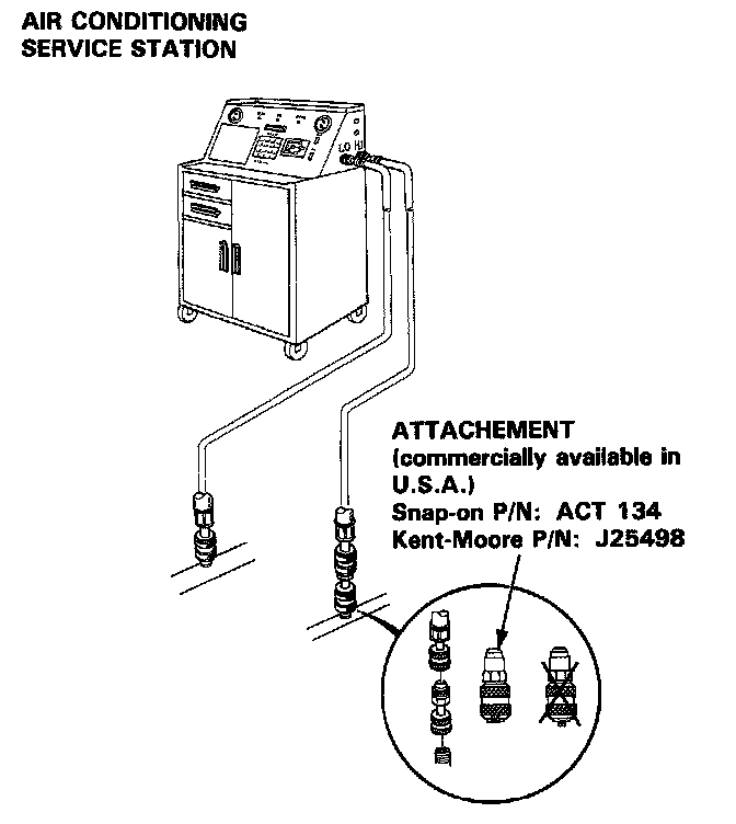 NOTE: Set the attachment to the gauge hose at high pressure side first, then install the gauge set as shown. When disconnecting the gauge hose at high pressure side, remove the attachment from the high pressure charging valve.