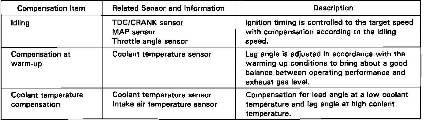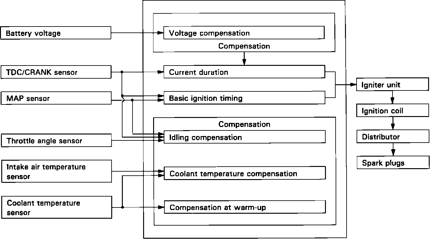 During normal engine operation the PGM-IG system provides maximum control of the ignition timing by utilizing a microcomputer in response to electronic signals transmitted by the TDC/CRANK sensor, throttle angle sensor, coolant temperature sensor, and MAP sensor. During cranking the ignition timing is fixed at 10° BTDC.