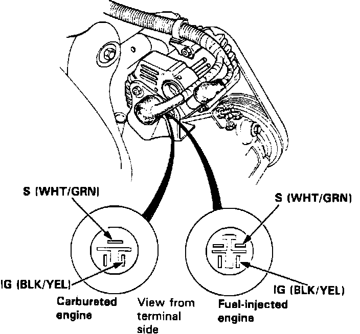 2. With ignition switch On, check for battery voltage between ground and alternator connector terminals IG and S On 1989 models or IG and ground on 1990-91 models, Figs. 3 and 4. If battery voltage is indicated at both terminals, proceed to step 3. If no voltage is indicated, check for the following: