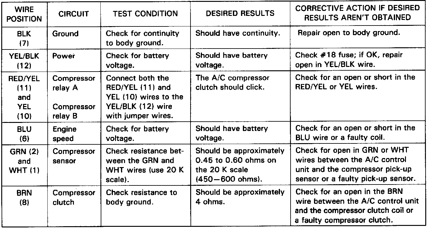 Perform the following tests with the A/C control unit's 12P connector disconnected, and the ignition switch, blower switch, and A/C switch ON.