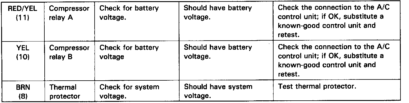 Perform the following tests with A/C control unit connected, engine running and the A/C system turned ON.