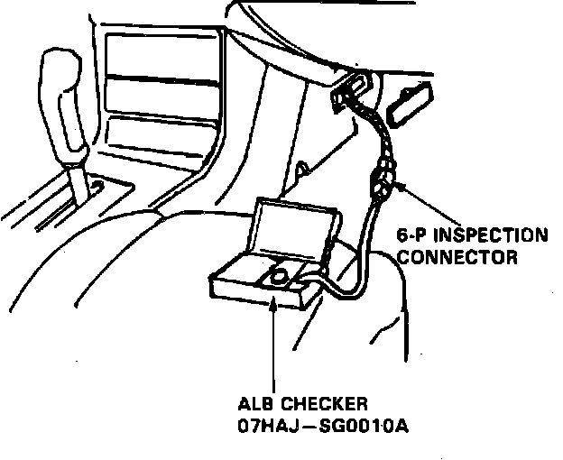1. Turn ignition switch off, then disconnect 6-P inspection connector from connector cover on the right side of front console and connect it to anti-lock brake checker No. 07HAJ-SG0010A or equivalent, Fig. 5.