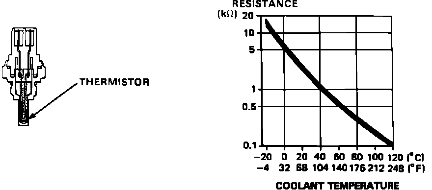 The coolant temperature (TW) sensor, located in the thermostat housing, is a temperature sensitive resistor (thermistor). The resistance of the thermistor decreases as the coolant temperature increases. Engine temperature is used by the ECU to determine ignition timing, fuel injector duration, purge control, idle speed, and EGR activation.