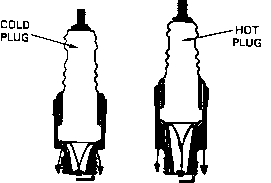 The spark plug provides a path for the high current of the secondary circuit to flow to ground. The only paths for this current are through the ground electrode and center electrode across the spark gap. The spark produced when the current jumps the gap and ignites the air/fuel mixture in the cylinder. The temperature of the spark plug is determined by the length of the insulator and the size of the heat sink area. The longer the insulator is, the smaller the heat sink area will be and this will cause the spark plug to be hotter. The center electrode temperature ranges from a low of 392~F (200~C) at 10 m.p.h. to a high of 1472~F (800~C) at 80 m.p.h..