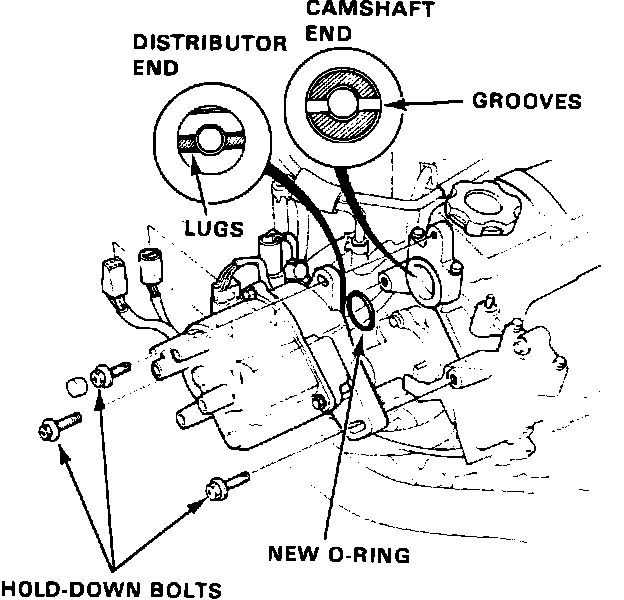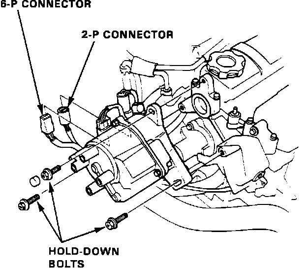 3. Remove the distributor hold-down bolts, then remove the distributor from the cylinder head.