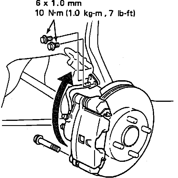 5. Swing caliper down into position, then install caliper bolt and tighten to specified torque.