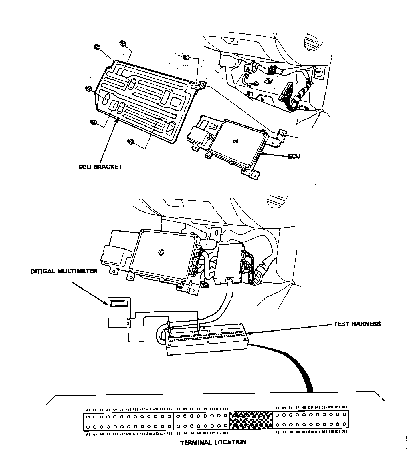 If the inspection for a particular failure code requires the ECU test harness, remove the right door sill molding, the small cover on the right kick panel, and pull the carpet back to expose the ECU. Remove the bolts securing the ECU bracket. With the ignition switch off, connect the ECU test harness. Then check the system according to the procedure described for the appropriate code(s) listed. The purpose of the ECU test harness is to allow circuit testing without having to back-probe the ECU harness. If the ECU test harness is unavailable, CAREFUL back probing of the ECU harness will have to be performed.